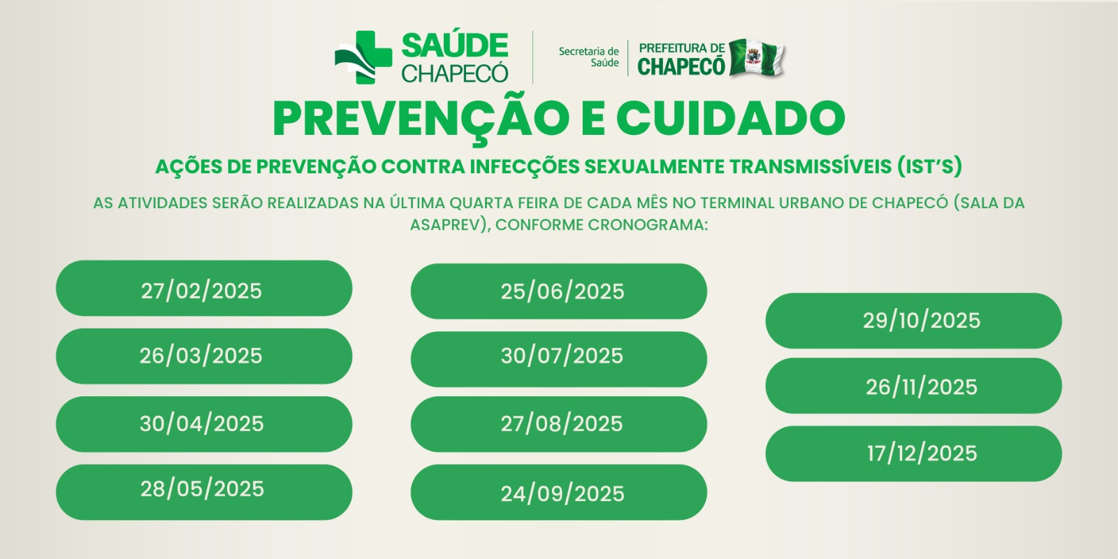 Além disso, tanto o SAE quanto às unidades de saúde de Chapecó oferecem testes rápidos para HIV, sífilis, hepatites B e C, garantindo diagngóstico e tratamento precoce, bem como orientação para a prevenção de Infecções Sexualmente Transmissíveis (IST) e HIV/AIDS.