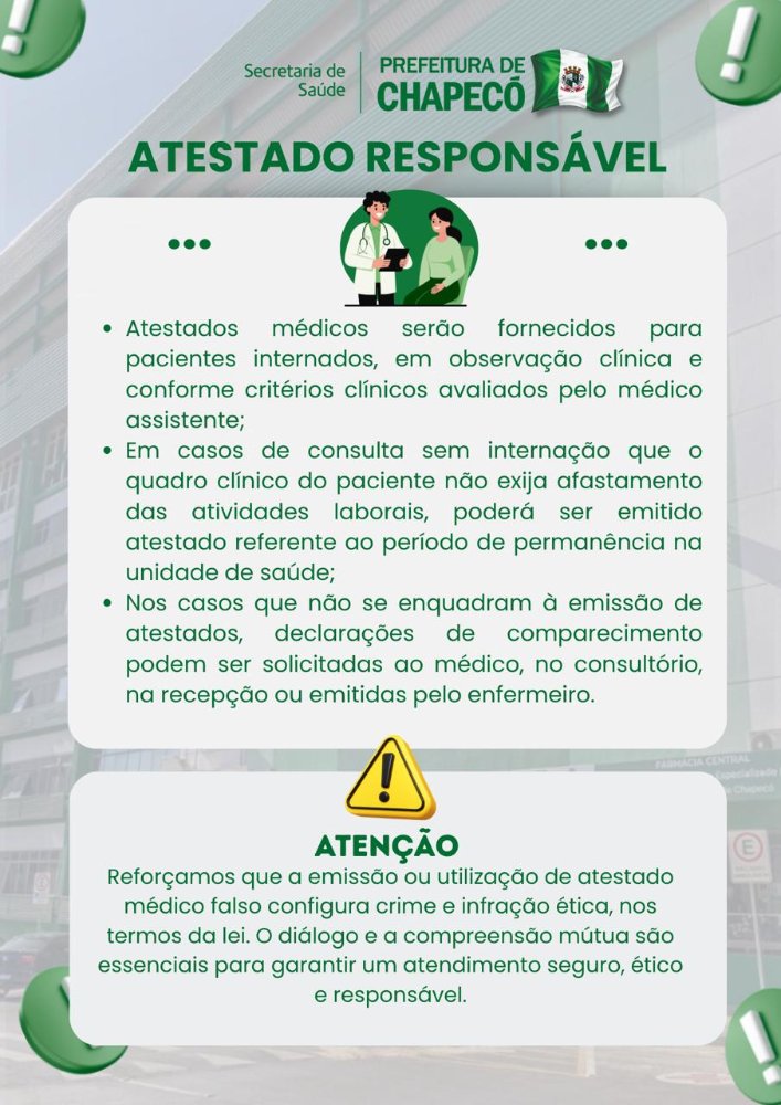 De acordo com dados da Secretaria de Saúde mais de duzentos mil atestados foram fornecidos nas 27 unidades de saúde, em 2025. Destes, mais de 140 mil foram somente na UPA e no PA Efapi. De acordo com o secretário de Saúde, João Lenz, a medida tem com objetivo o uso mais consciente do atestado, para quem realmente tenha essa necessidade. Com menor fluxo de pessoas na UPA e no PA, os pacientes poderão ser atendidos em menos tempo e com mais qualidade.