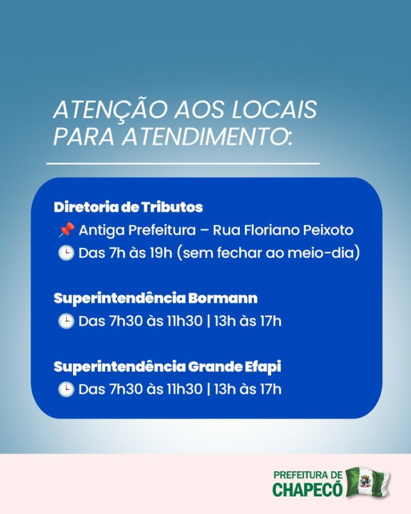 Os interessados devem ir na Diretoria de Tributos, na antiga prefeitura, na rua Floriano Peixoto, das 7h às 19h. Ou então nas superintendências do Bormann ou da Grande Efapi, das 7h30 às 11h30 e das 13h às 17h.